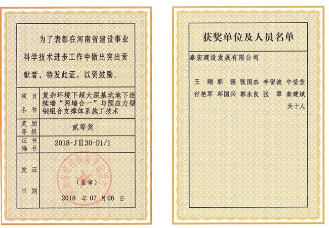 公司申报的“郑州市三环快速化项目京广路互通立交工程第三标段施工新技术应用示范工程”、“南阳电信枢纽楼施工新技术应用示范工程”和“复杂环境下超大深基坑地下连续墙‘两墙合一’与预应力型钢组合支撑体系施工技术”3项科技成果,分别荣获一等奖1项,二等奖2项。