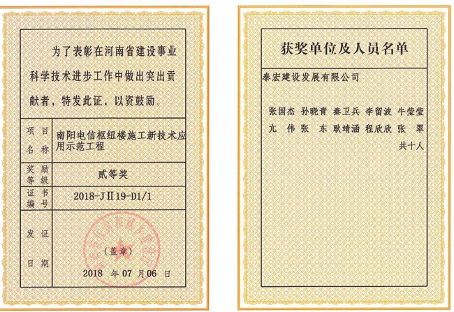 南阳电信枢纽楼施工新技术应用示范工程获奖证书