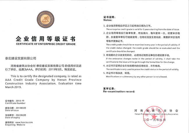 近年来随着国家高度重视信用建设,信用顶层设计不断完善,公司顺应信用发展的新形势,不断提高行业诚信意识和信用管理水平。2018年参评郑州市城乡建设局组织的郑州市建筑施工企业信用评价活动,荣获“AAA级信用企业”荣誉称号;连年荣获中国建筑业协会、中国施工企业管理协会“AAA级信用企业”、“守合同重信用”企业、“投标企业诚实守信单位”等荣誉称号。信用建设取得了显著成绩,提升了企业品牌竞争力,促进了企业的持续健康发展。