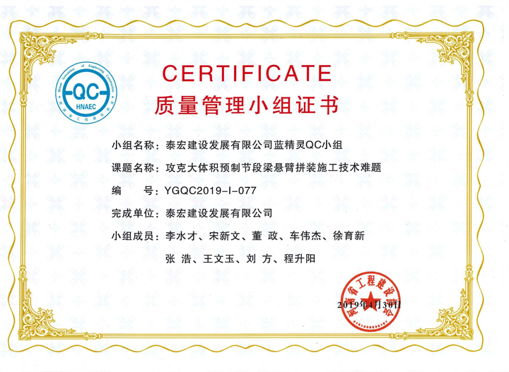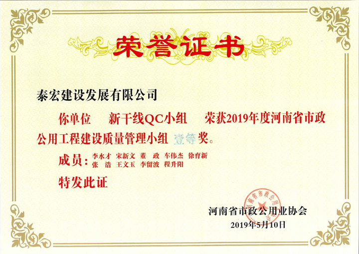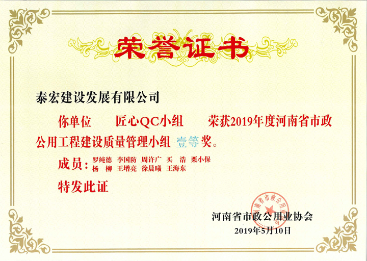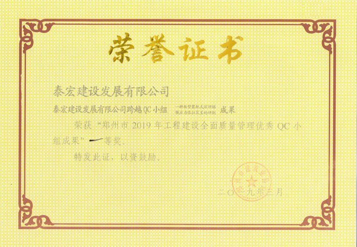 2019年度,泰宏建设各QC小组紧紧围绕本年度QC小组活动 “传承精神、规范活动、助力提升”的主题,扎实推进、持续创新,依托承建的高、精、尖项目对工程技术难题进行了技术攻关、技术创新,总结形成了9项QC成果,涵盖了现场型、攻关型、创新型等QC课题类型,并分别申报了“河南省建筑业协会工程建设质量管理小组”、“河南省工程建设协会工程建设质量管理小组”、“河南省市政公用工程建设优秀质量管理小组”和“郑州市建筑业协会工程建设质量管理小组”,经专家资料评审和现场发布打分,公司QC成果捷报频传,共荣获省级QC成果一等奖8项,市级QC成果一等奖3项,二等奖6项,再创佳绩。