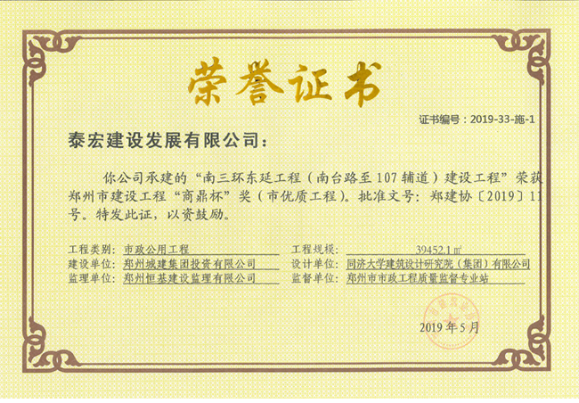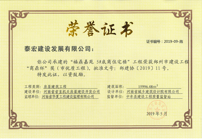 5月16日上午,郑州市建筑业协会六届三次理事会暨三次常务理事会在郑州举行。协会常务理事和理事单位代表及获奖单位代表共100余人参会。会上,通报表彰了2019年度郑州市建设工程“商鼎杯”奖获奖名单,公司承建的“南三环东延工程”、“福鼎嘉苑5号底商住宅”两项工程名列其中。