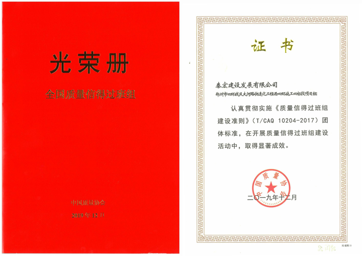 近日,中国建筑业协会质量管理与监督检测分会和中国质量协会相继颁发了2019年度工程建设质量信得过班组证书,公司申报的“郑州市四环线及大河路快速化工程西四环施工四标段项目班组”,荣获中国建筑业协会质量管理与监督检测分会和中国质量协会“2019年度工程建设质量信得过班组”双证书。