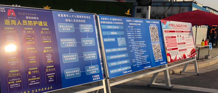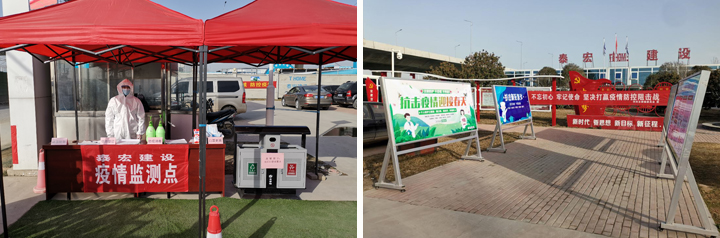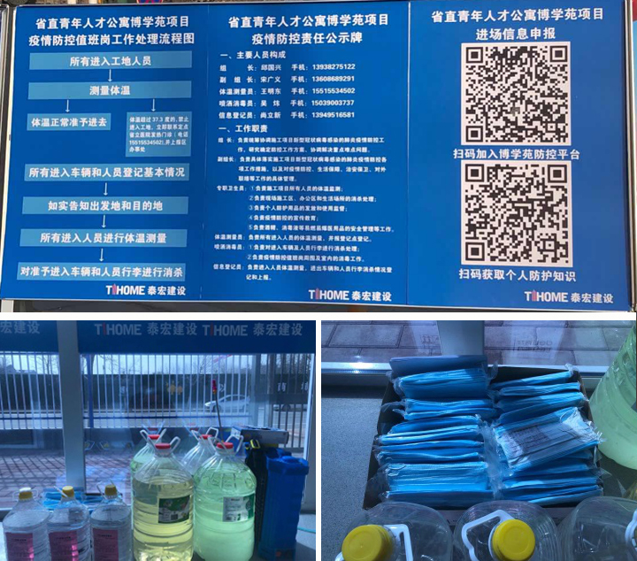 对即将复工的工人,项目提前14天进行报备,施工现场设置两级卡点,并制定人员进场流程,建立项目防控信息平台、进出入登记、测温、消毒等制度,并在现场设置疫情防控宣传标语和展板,设置专用废旧口罩、手套回收箱等设施,提高人员的防控意识。