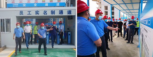 刘处长及相关领导一行分别对项目“质量样板区、安全体验区、生产区、办公区、生活区、工程实体样板、数字化控制中心等进行了参观指导,对现场安全文明标准化施工、质量标准化管理、安全风险双重预防体系落实等方面工作给予了肯定;并对项目开展的BIM+智慧数字化工地系统、VR安全教育系统、智能安全帽、塔吊安全监测+吊钩可视化系统、智能环境检测系统、塔机防碰撞、安全双重预防体系、劳务实名制系统、质量巡检、安全巡检及进度模拟等智慧工地方面的应用进行了高度认可。同时还视察了劳务实名制登记大厅、劳保用品发放大厅、违章再教育中心、应急救援物资大厅的使用情况。