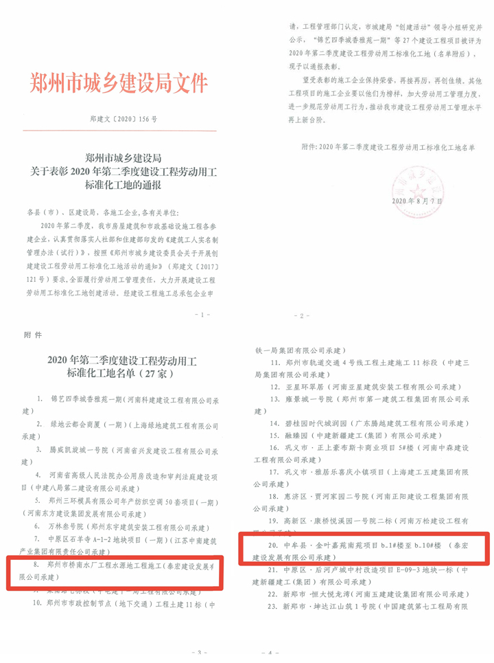 8月7日,郑州市城乡建设局就2020年第二季度创建建设工程劳动用工标准化工地进行通报表彰(郑建文〔2020〕156号),公司承建的“郑州市桥南水厂工程水源地工程”、“金叶嘉苑南苑项目b-1#楼至b-10#楼”两项工程荣获表彰。