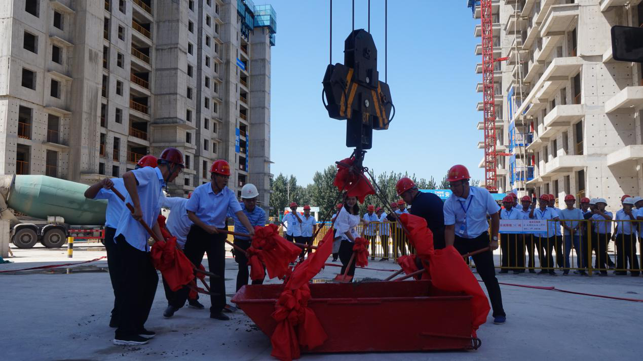 仪式上,各级领导共同使用铁锹将本工程最后一方混凝土铲入混凝土料斗,由塔吊将料斗吊至屋顶完成最终混凝土浇筑封顶。