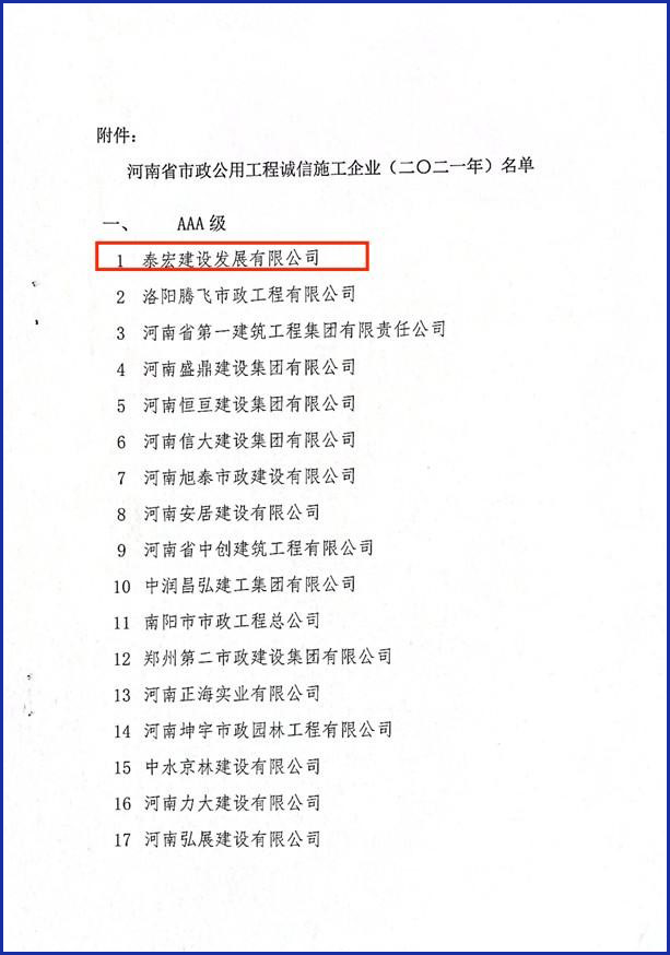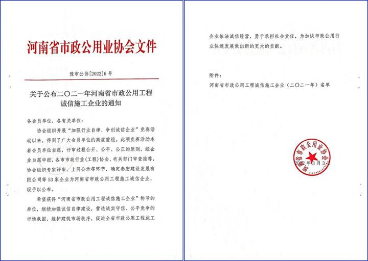 公司被评为“河南省市政公用工程施工AAA级诚信企业”