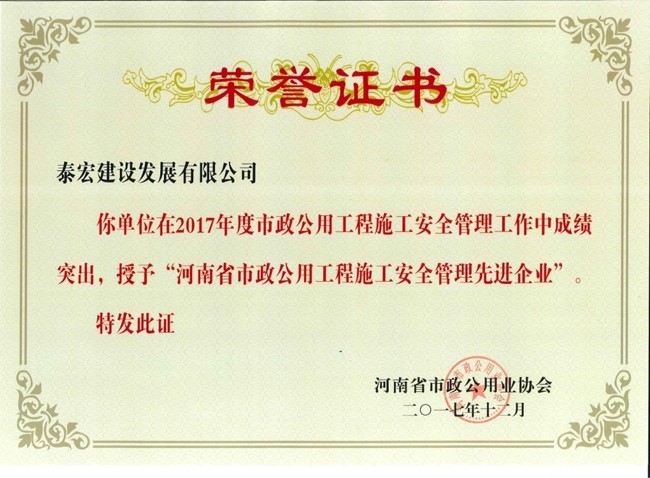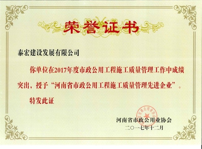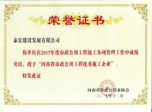 会上对2017年度“河南省市政公用工程优秀施工企业”等先进单位和个人进行了表彰及颁发证书;公司荣获“2017年度河南省市政工程优秀施工企业”、“2017年度河南省市政工程施工质量管理先进企业”、“2017年度河南省市政工程施工安全管理先进企业”、“2017年度河南省市政工程技术创新先进企业”荣誉奖项。