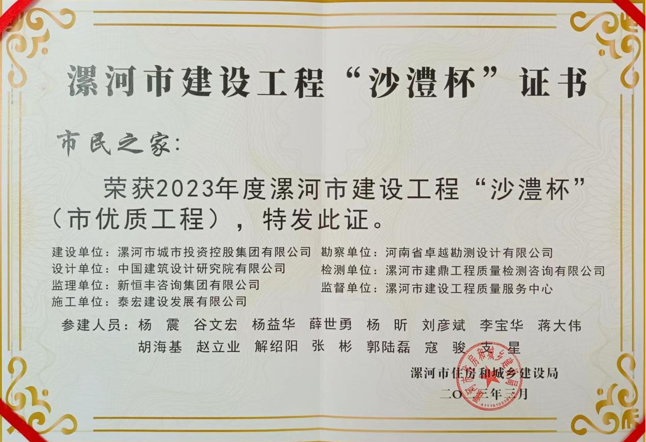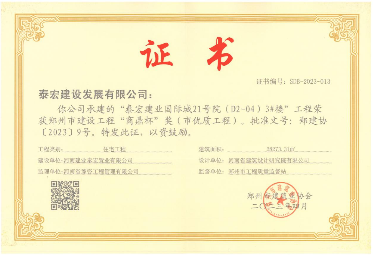 近日,各项目捷报频传。泰宏建设公司承建的泰宏建业国际城21号院(D2-04)3#楼、漯河市市民之家、安阳市御水园商住小区38#住宅楼、驻马店市中心医院分院病房综合楼等项目分别荣获各市级优质工程“商鼎杯”“沙澧杯”“殷都杯”“天中杯”奖。