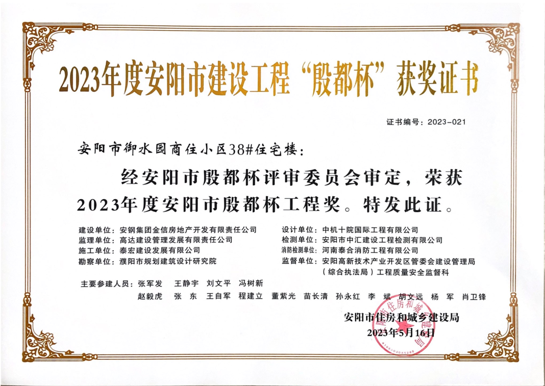 安阳市御水园商住小区38#住宅楼荣获“殷都杯”奖