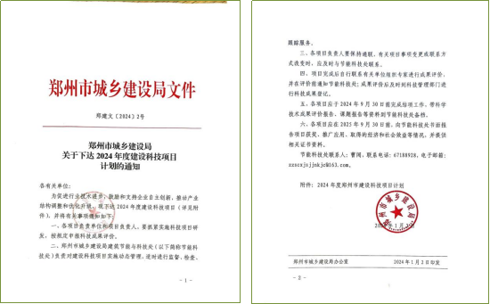 1月2日,郑州市城乡建设局印发了“关于下达2024年度建设科技项目计划的通知”,江南网投申报的2项成果“陶瓷棉装配式复合保温墙体技术研究”和“无配重吊篮施工关键技术研究”,经专家评审,获得郑州市2024年度建设科技项目计划立项。