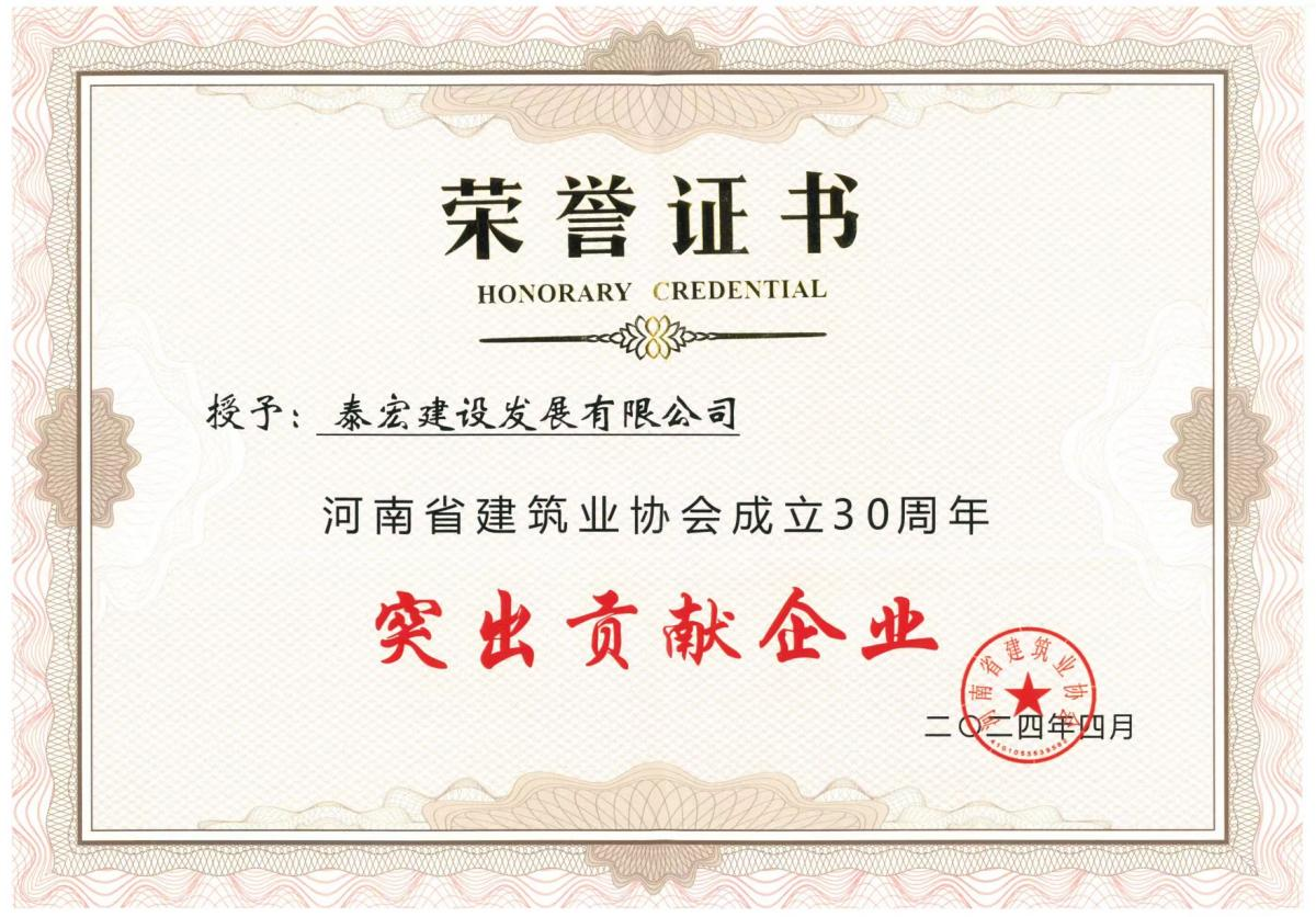 河南省建筑业协会成立30周年突出贡献企业荣誉证书